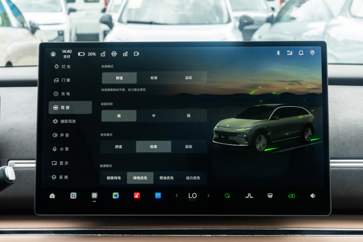 外观设计上,26 款零跑全新 C11 延续了零跑品牌 “科技自然美学” 的理念,在细节处理上更显精致。前脸的日行灯带经过优化后更为修长,如同一条细长的光带横贯前脸,即使在白天也具有不错的辨识度。主动闭合式进气格栅与整体造型融合自然,当车辆需要散热时,格栅会自动打开;在高速行驶时,格栅则会关闭以减少风阻,风阻系数降至 0.28Cd,对续航能起到一定的积极作用。车顶的 128 线激光雷达安装位置合理,被一个小凸起保护着,既不会影响车辆的整体美观,又能保证其探测范围。车身侧面采用双色涂装,营造出悬浮式车顶的视觉效果,搭配 20 英寸的轮圈和前四活塞绿色卡钳,既具备家用车型的稳重感,又不失运动气息。轮圈的造型独特,多条幅设计兼具美观性和一定的空气动力学作用。无框车门关闭后密封性较好,行驶过程中车内的噪音控制得不错,即使在高速行驶时,风噪和胎噪也不会过于明显,不会对车内人员的交流造成影响。隐藏式门把手在解锁时会自动弹出,弹出力度适中,使用方便,锁车后与车身贴合,进一步降低了风阻。车尾的贯穿式尾灯在夜晚点亮后辨识度很高,内部的点阵式光源如同闪烁的星星,具有一定的美感。新增的 “雾凇米” 配色淡雅清新,再加上星河银等六种车色,能够满足不同用户的审美喜好。